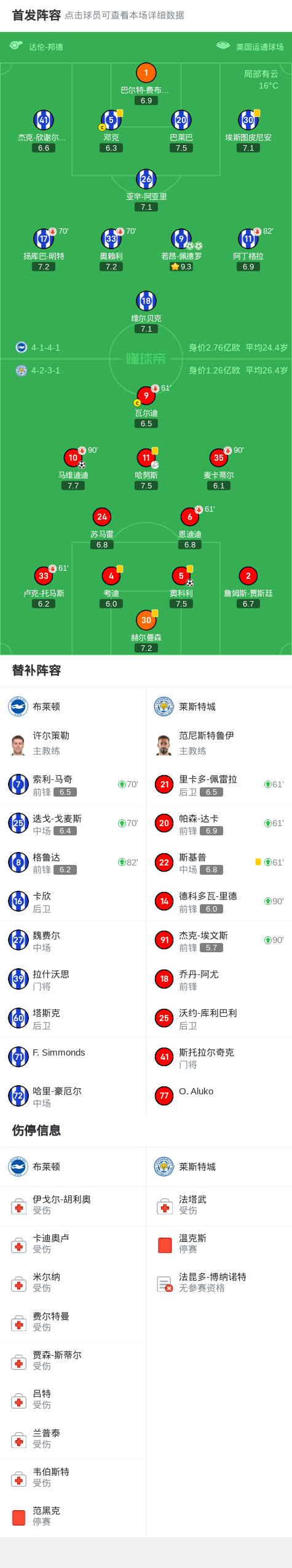 第38分钟,马维迪迪在禁区内展露绝佳机会,连续两次射门,最终将球送入球网,莱斯特城1-1将比分扳平。此时的比赛场面异常火爆,双方你来我往,场上紧张氛围弥漫。布莱顿努力寻找机会,而莱斯特城也在不断施压,希望取得领先进球。